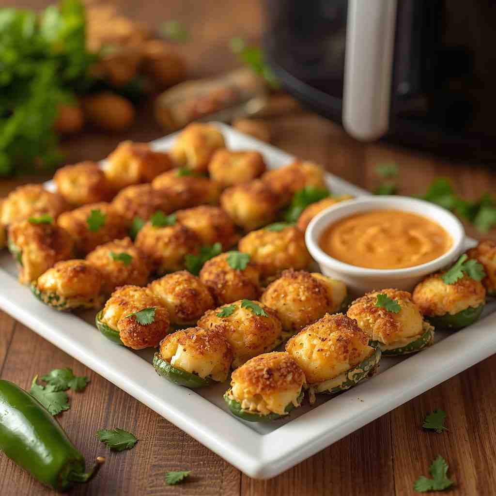 Step 5: Air Fry the Jalapeño Poppers : Preheat air fryer to 375°F (190°C) for 3 minutes. Place poppers in the air fryer basket in a single layer (don’t overcrowd). Air fry for 8–10 minutes, turning halfway through, until golden and crisp. Remove carefully and let cool slightly before serving — the filling will be hot!