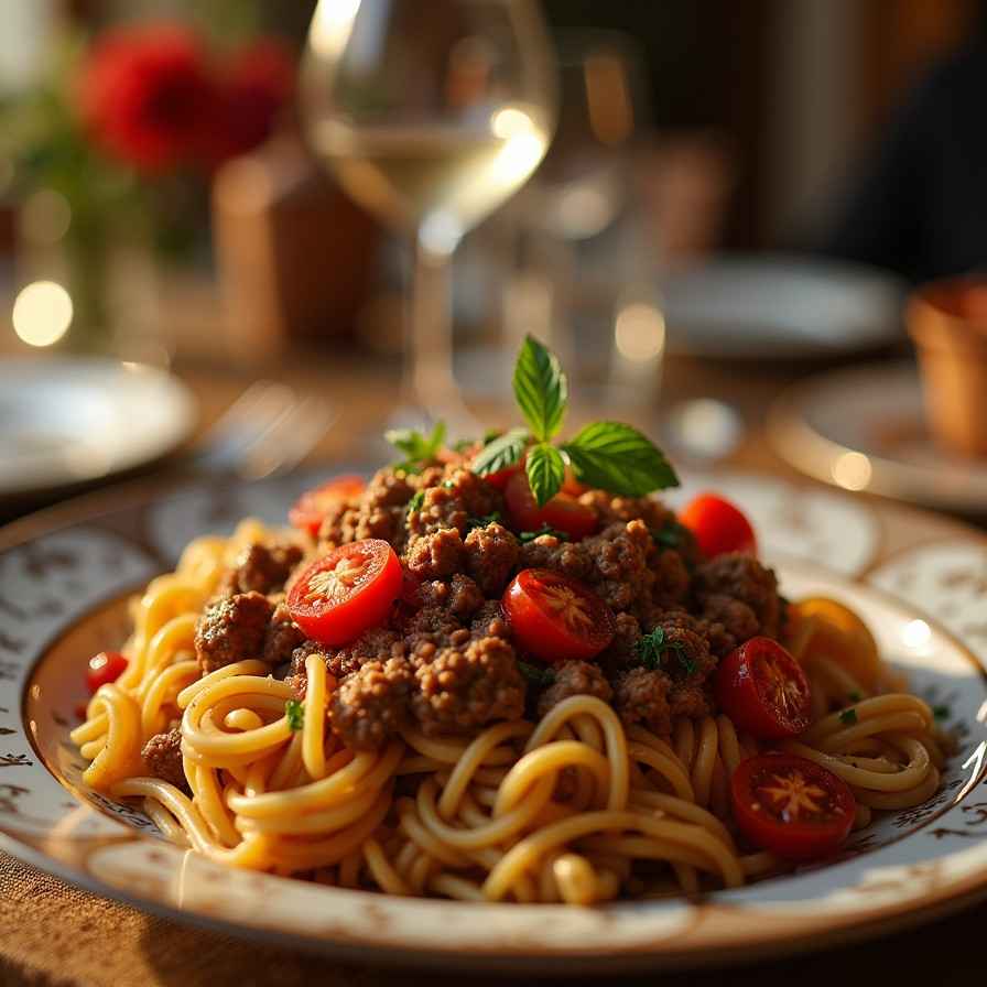 Cook the pasta separately, brown the beef with vegetables, simmer in tomato sauce, and combine everything until well mixed and flavorful.