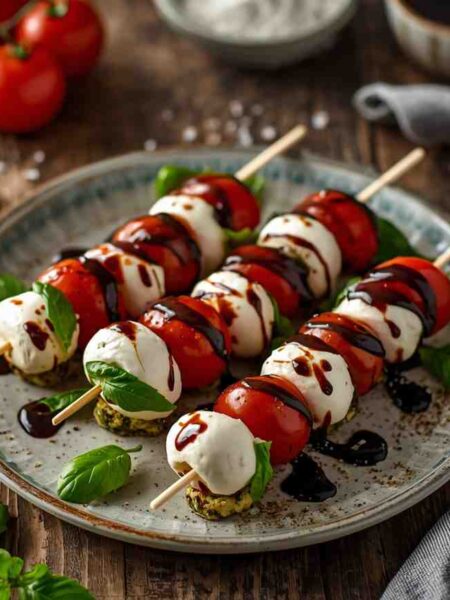 - Caprese Skewers: Use only cherry tomatoes, mozzarella, and basil with balsamic drizzle