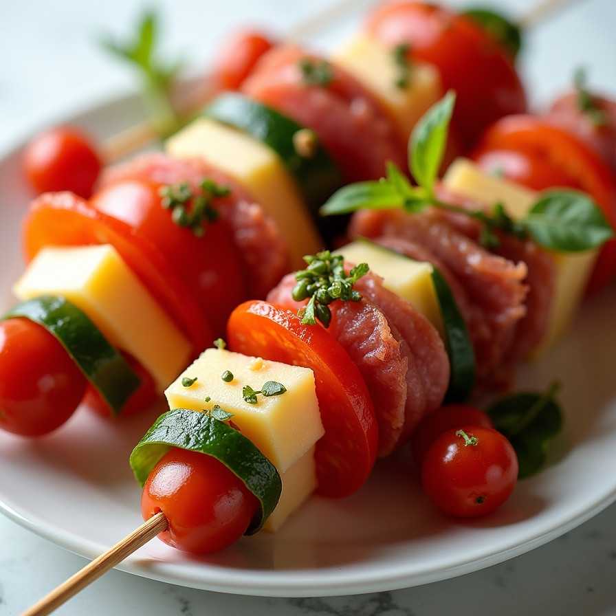 - Thread Skewers: Assemble cherry tomato, meat, mozzarella, olive, and artichoke (or desired combination).