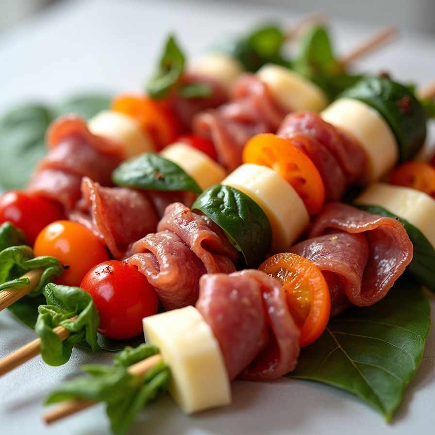 - Assemble Skewers: Thread ingredients onto skewers in the following order or as preferred: cherry tomato, folded cured meat, mozzarella ball, olive, artichoke heart, and optional roasted pepper. Repeat until skewer is filled, leaving space at the ends for handling.
