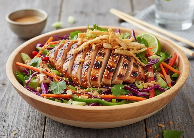 - Add Protein & Crunch – Top with sliced chicken, roasted peanuts/almonds, and sesame seeds.