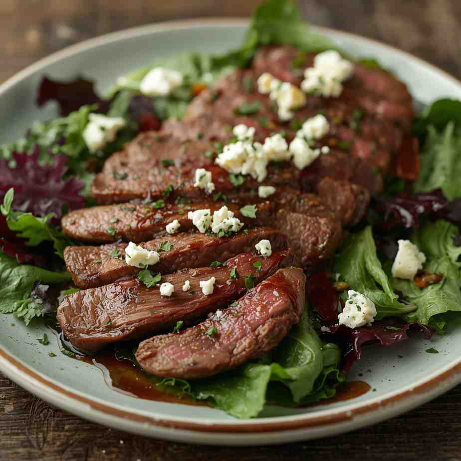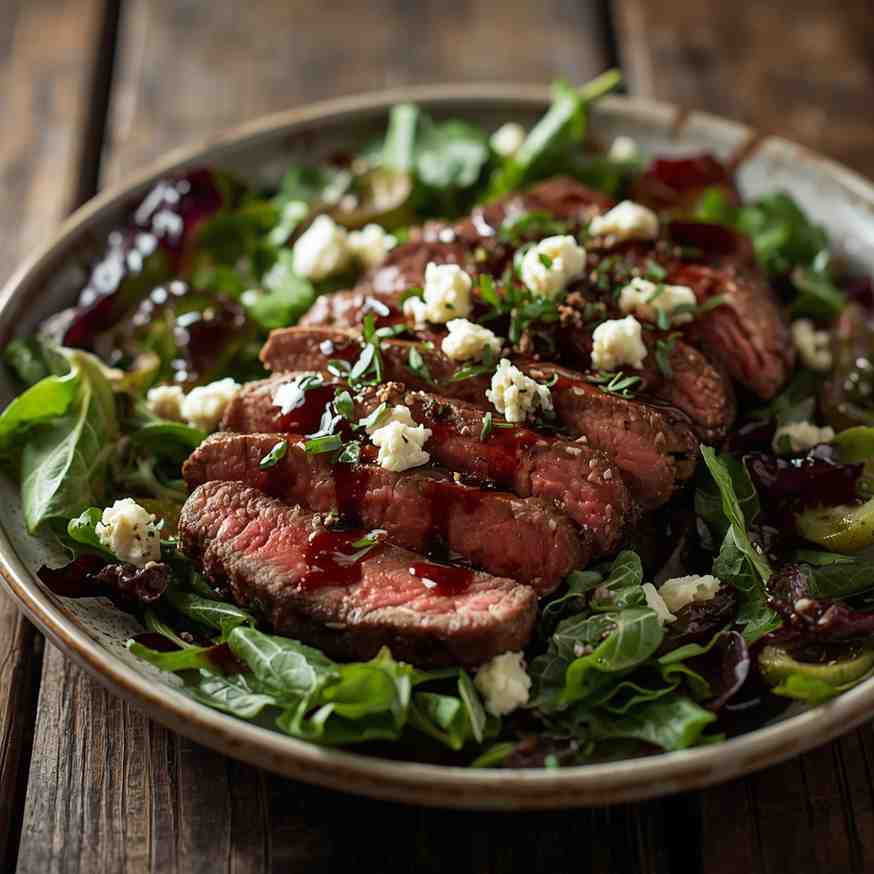 Balsamic Steak & Gorgonzola Salad is an elegant yet easy dish that perfectly balances rich, savory flavors with fresh, crisp textures. Juicy balsamic-marinated steak is grilled to perfection and served over a bed of mixed greens, cherry tomatoes, red onions, and crunchy walnuts or pecans. The finishing touch — a sprinkle of creamy Gorgonzola cheese and a drizzle of tangy balsamic glaze — elevates this salad into something truly restaurant-worthy.