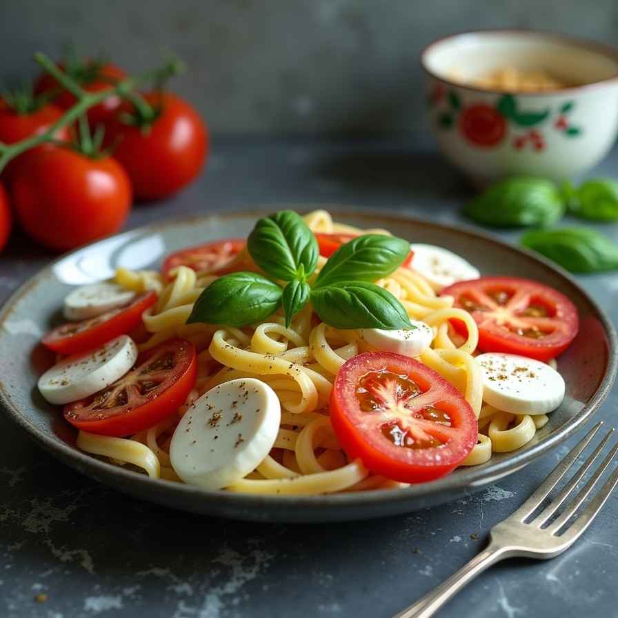 - Combine pasta with tomatoes, mozzarella, and basil.
