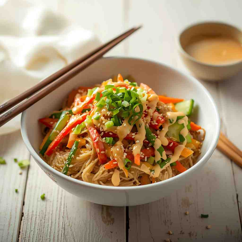 Step 4: Combine Everything : Add the cooled noodles to the bowl of vegetables. Pour the sesame dressing over the top. Toss everything together gently until the noodles and veggies are evenly coated.