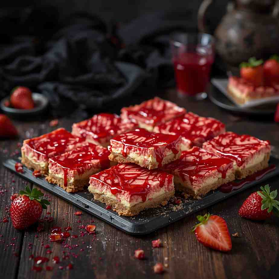 Serve these bars chilled, with a drizzle of extra strawberry sauce and a few fresh berries on top. For a full Halloween effect, place them on a dark serving platter and drizzle the sauce artistically — like splatters of blood. Serve with whipped cream or a scoop of vanilla ice cream if you want extra indulgence.