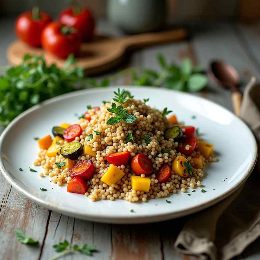 Farro is cooked until tender, vegetables are roasted to bring out their natural flavors, and everything is combined with a zesty dressing. Optional toppings enhance the flavor and texture of the salad.