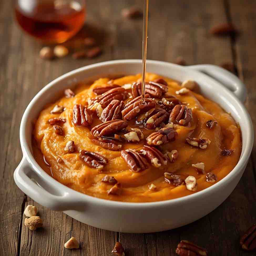 Mashed Sweet Potatoes with Maple Syrup and Pecans
