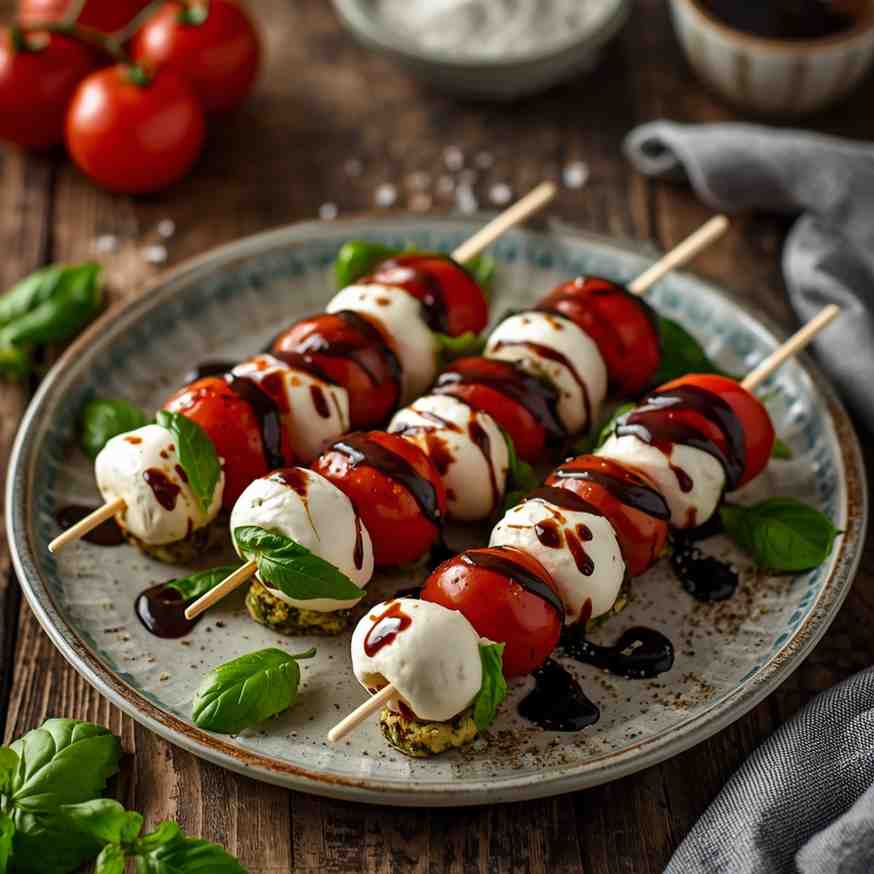 Each bite offers a perfect balance — the sweetness of ripe tomatoes, the rich creaminess of mozzarella, the herbal freshness of basil, and the tangy finish of balsamic reduction. Simple, refreshing, and sophisticated, these skewers are a celebration of pure ingredients and vibrant flavors.