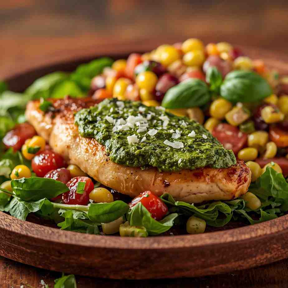 Pesto Chicken with Corn & Bean Salsa is a vibrant, wholesome, and flavor-packed dish that perfectly balances creamy, herby pesto with the freshness of corn, beans, and juicy grilled chicken. The combination of tender chicken breast coated in aromatic basil pesto and a colorful salsa made from sweet corn, black beans, cherry tomatoes, and lime brings a beautiful mix of textures and flavors to your plate.