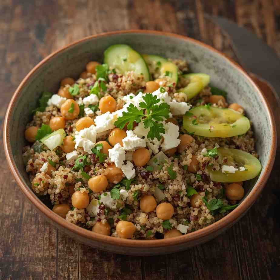Quinoa Salad with Chickpeas, Cucumber, and Feta is the perfect blend of freshness, nutrition, and bold Mediterranean flavors. This vibrant salad combines fluffy, nutty quinoa with protein-packed chickpeas, crisp cucumbers, juicy tomatoes, and creamy feta cheese — all tossed in a zesty lemon-olive oil dressing.