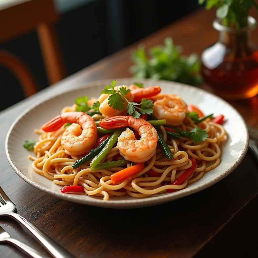 Cook noodles, stir-fry shrimp and vegetables, add sauce, toss with noodles, and serve hot.